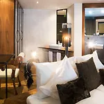 The cosy rooms include an adjoining terrace and a balcony, furnished with a stone fireplace, and some of them face the patio. The bathroom is equipped with a walk-in shower and a separate toilet, along with hairdryers and bath sheets.